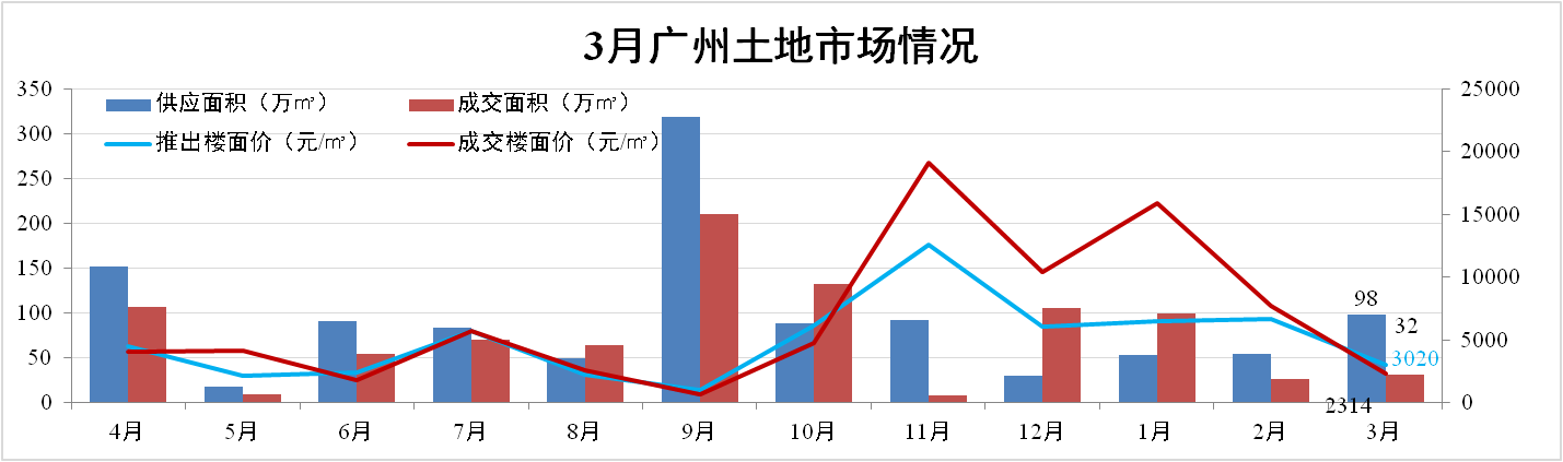 3月广州市共推出10宗地块,共有6宗成交。其中推出面积总额为98万㎡,成交32万㎡ ,推出楼面价3,020元/㎡,成交楼面价2,314元/㎡。